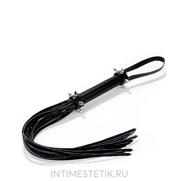 Многохвостая кожаная плеть (флогер) Spiked Leather Whip – стильный черный универсальный ударный девайс для эротических ролевых игр и практик БДСМ. Он состоит из рукояти с 10 шипами, сделанных из металла высокого качества, удобной черной кожаной петли для фиксации изделия на запястье (темляк) и множества «хвостов», нарезанных из тонких полос кожи.