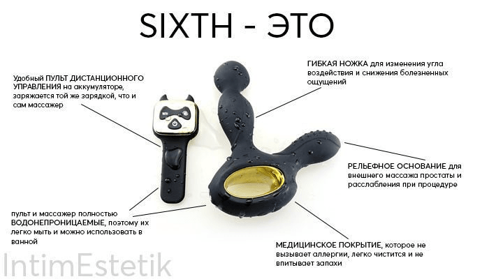 Форма и габариты массажера разработаны с учетом анатомического строения организма мужчины. Поверхность устройства выполнена из медицинского силикона высшего класса. Это гарантирует, что массаж не вызовет раздражения или аллергическую реакцию. Важной особенностью массажера простаты Sixth является беспроводной принцип зарядки аккумулятора. Магнитное зарядное устройство делает массажер действительно водонепроницаемым. Устройство комплектуется удобным пультом дистанционного управления.