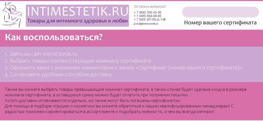 Удиви свою половинку или близкого друга приятным подарком! Сертификаты магазина ИнтимЭстетик можно приобрести в электронном или бумажном варианте. Получатель сможет выбрать любой подарок по душе среди тщательно отобранного огромного ассортимента нашего магазина!