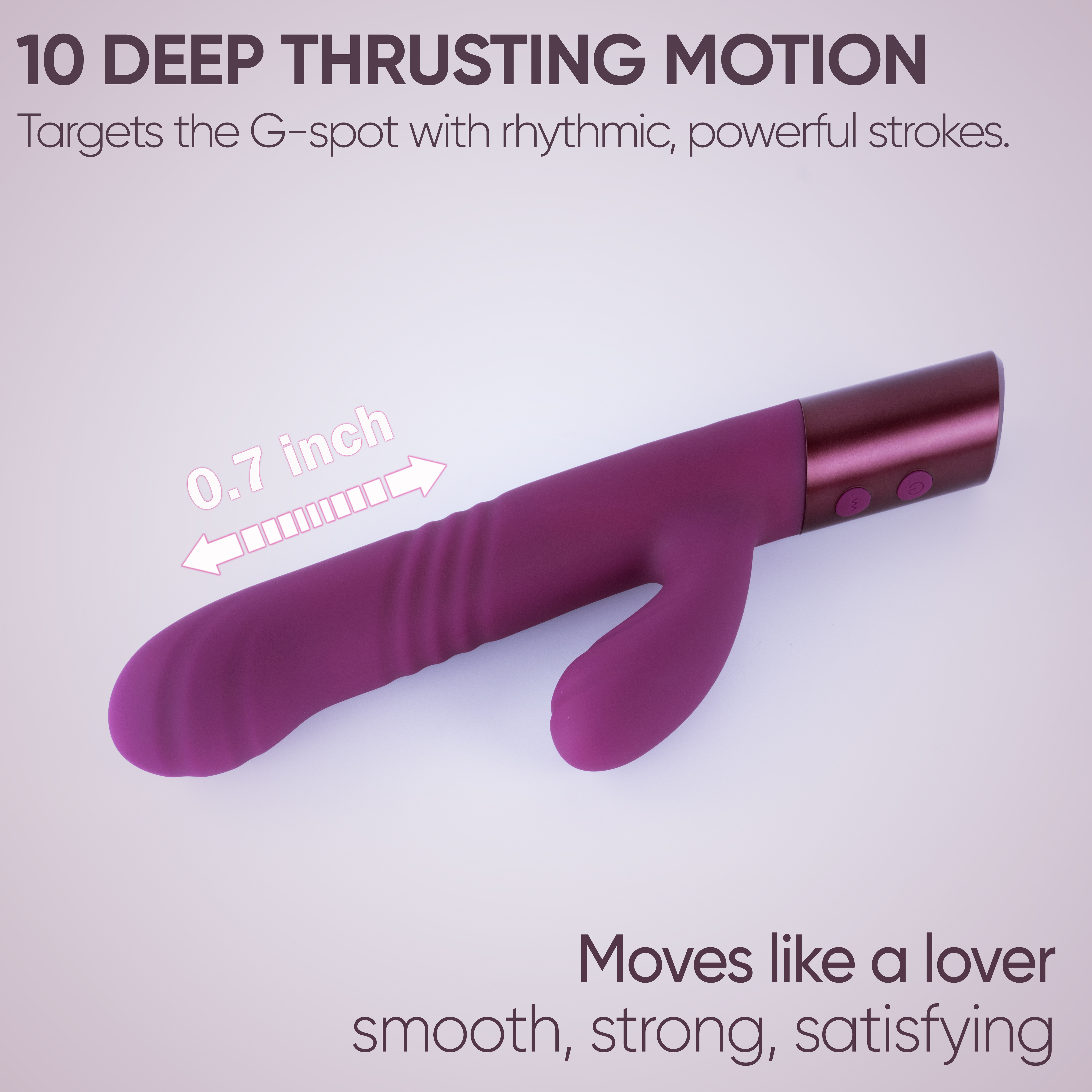 Головка с плавными контурами обеспечивает целенаправленную внутреннюю стимуляцию с тремя скоростями движения, а культовый кролик дразнит вас трепетными вибрациями, создавая полное погружение. Вы можете использовать каждый мотор по отдельности или вместе, создавая индивидуальный опыт, адаптированный под ваш ритм и предпочтения. Эргономичный дизайн и интуитивное управление делают Thrusty лёгким и комфортным в использовании.
